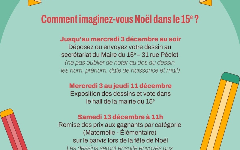 Jusqu'au mercredi 3 décembre, les enfants des écoles maternelles et élémentaires du 15e sont invités à participer à un concours de dessin autour de la thématique « Comment imaginez-vous Noël dans le 15e ? » Déposez ou envoyez votre dessin au secrétariat du Maire du 15e, 31 rue Péclet. Du mercredi 3 au jeudi 11 décembre, les dessins seront exposés dans le hall. Samedi 13 décembre, des prix seront remis aux gagnants sur le parvis de la Mairie lors de la fête de Noël.