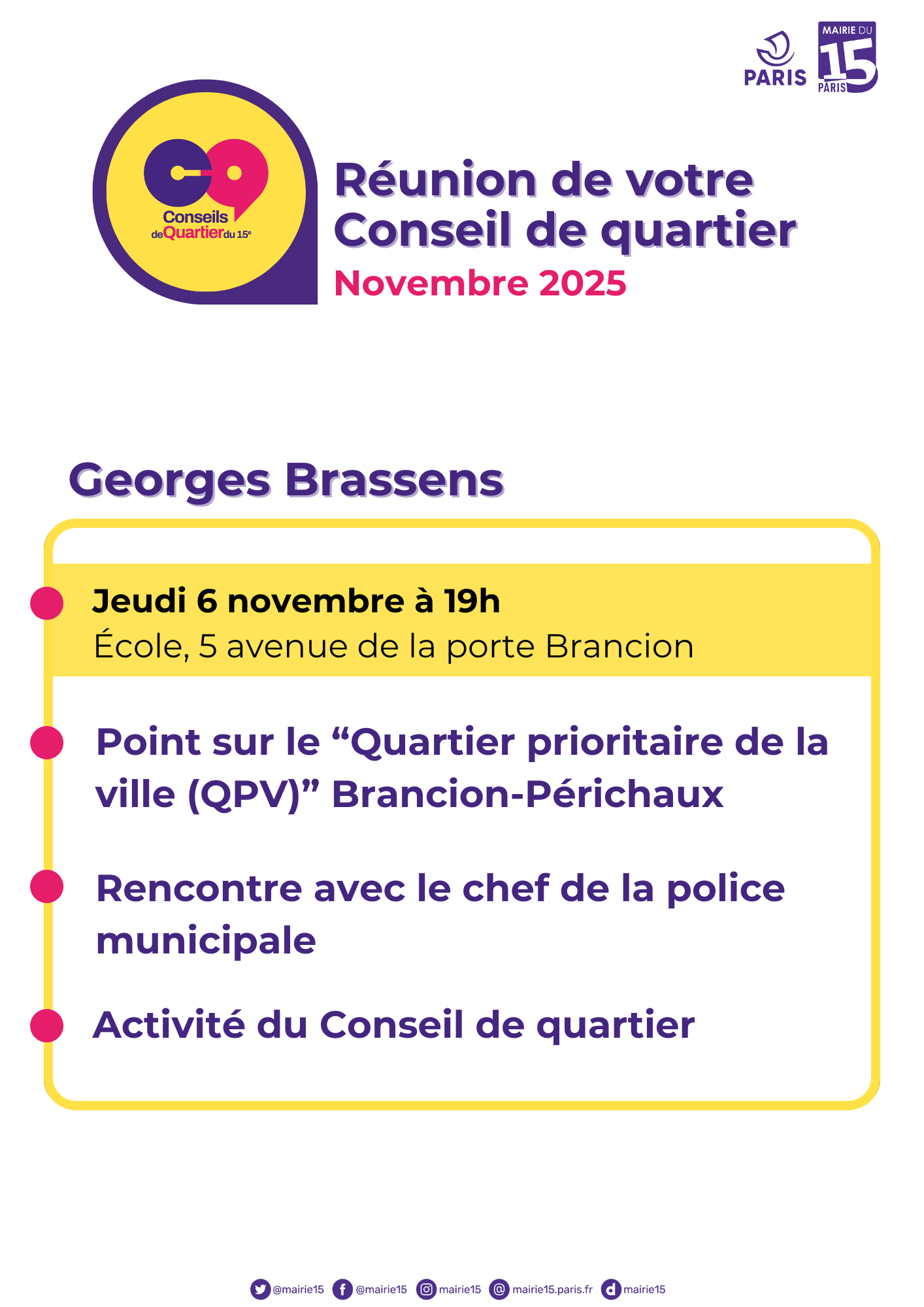 L'Adjointe au Maire du 15e en charge de ce Conseil de quartier est Madame Louise-Agathe CHARPENTIER