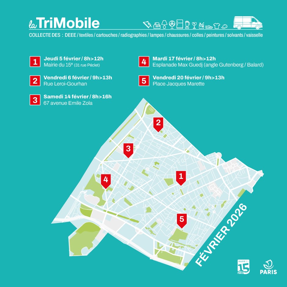 Depuis maintenant cinq ans, la Mairie du 15e met en place un service de recyclage des déchets et petits encombrants. Grâce au Trimobile vous pouvez déposer vos petits encombrants dans le camion remorque Eco-Point Mobile stationné sur la voie publique. Les déchets sont ensuite traités afin d’être recyclés.