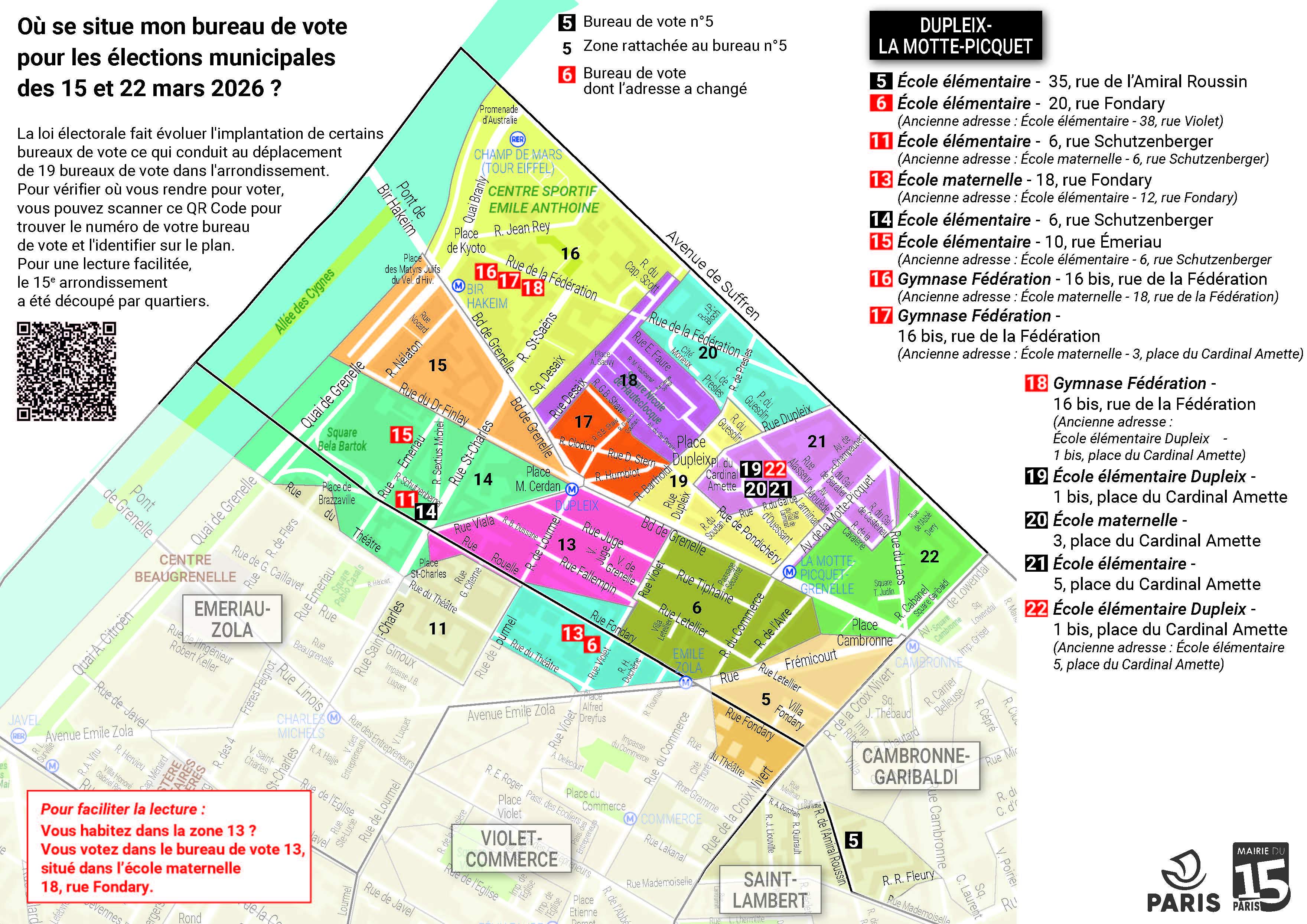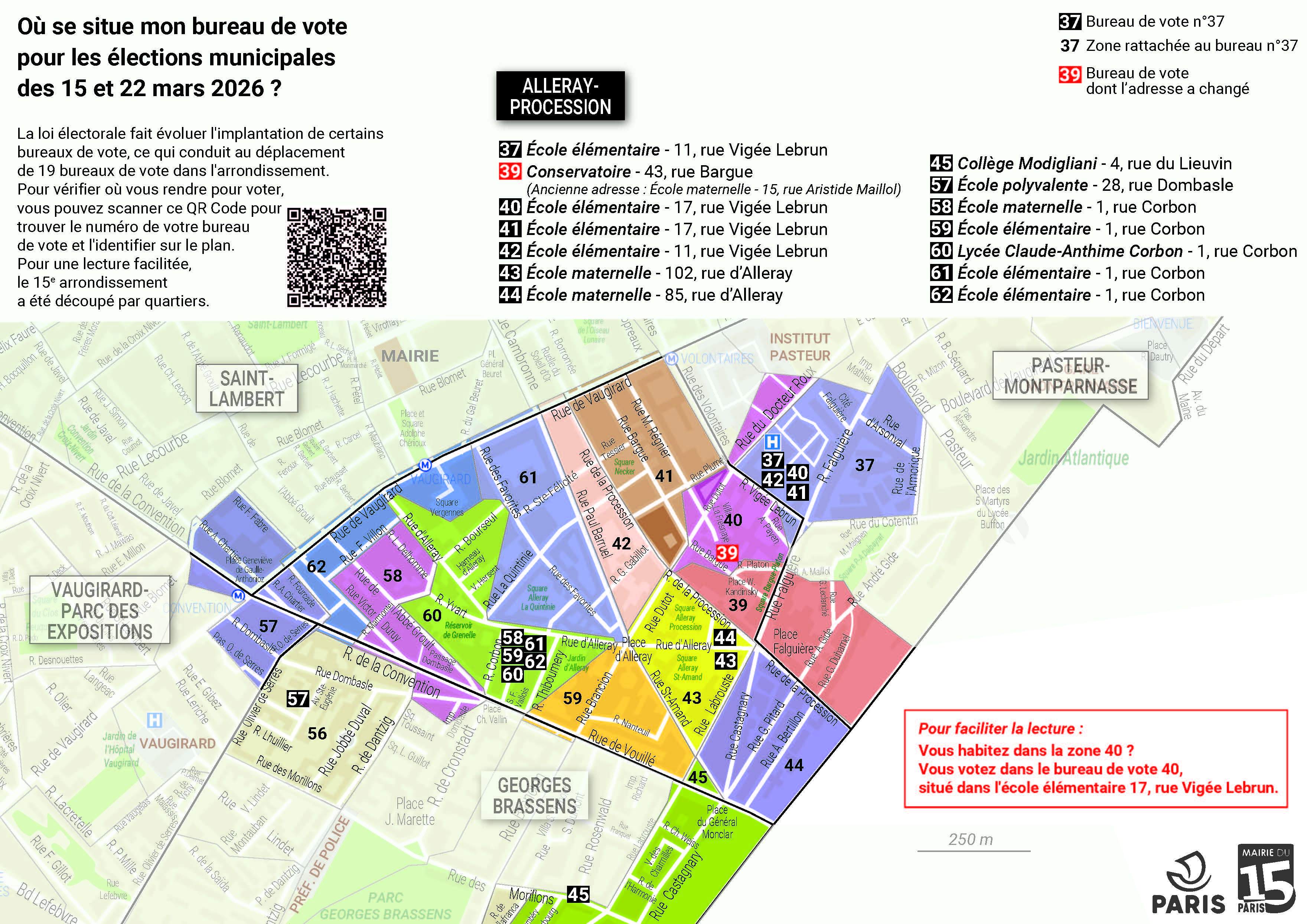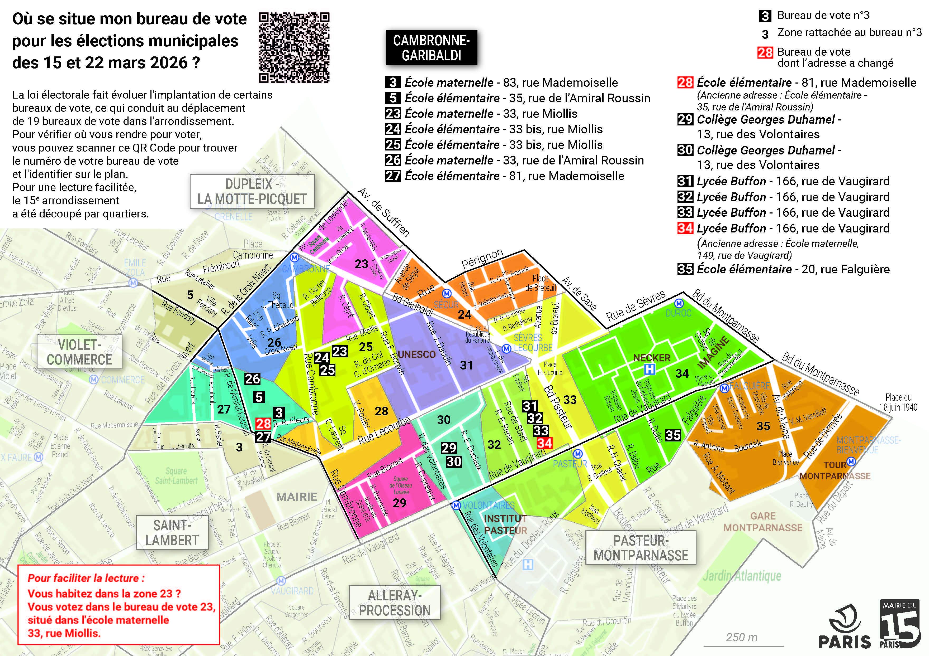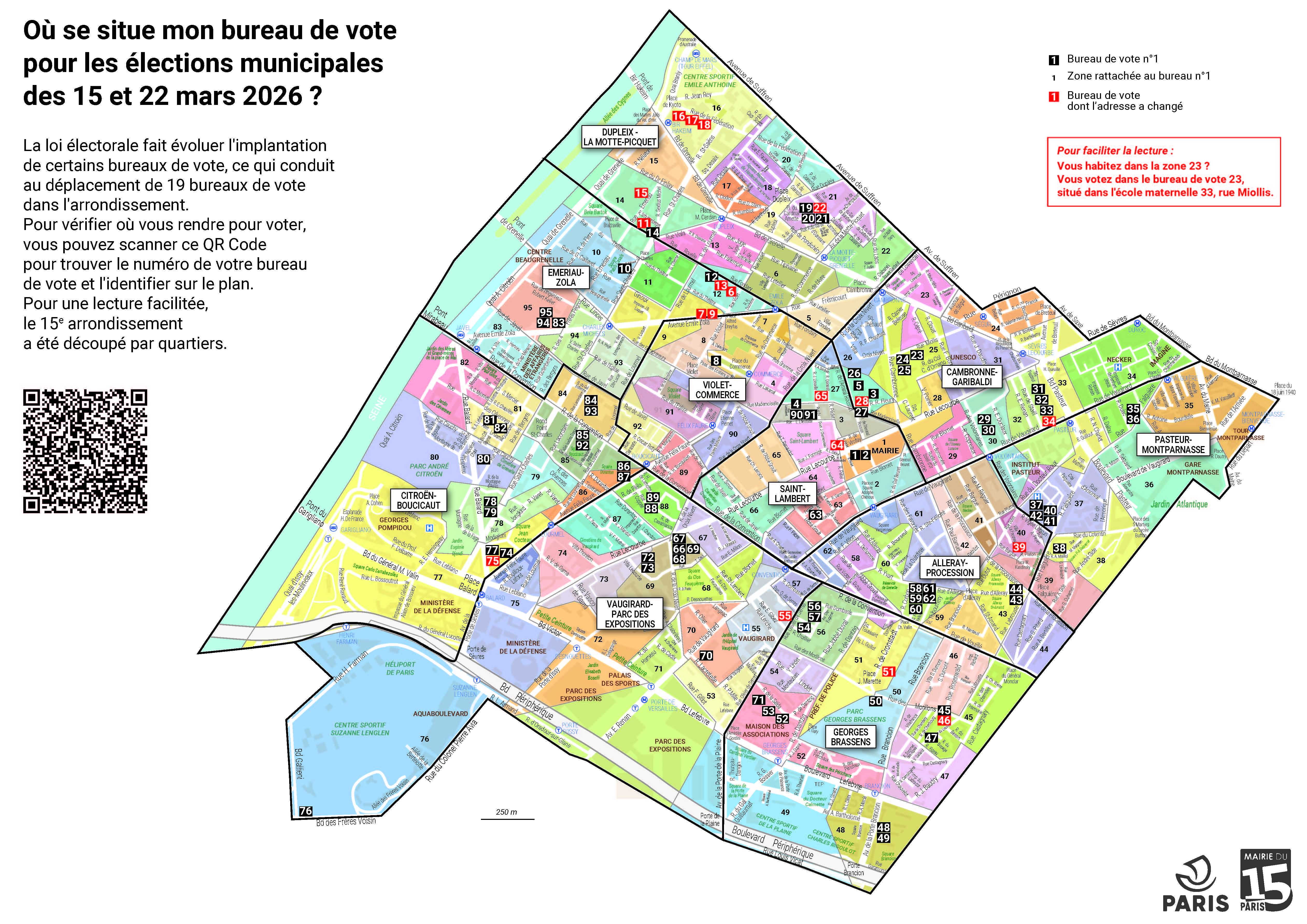 La réforme du mode de scrutin à Paris fait évoluer l'implantation de certains bureaux de vote pour les élections municipales des dimanches 15 et 22 mars. La Mairie du 15e vous invite à vérifier à l'avance la localisation de votre bureau de vote. Identifiez-le sur les plans ci-dessous. Pour une lecture facilitée, le 15e arrondissement a été découpé par quartiers.