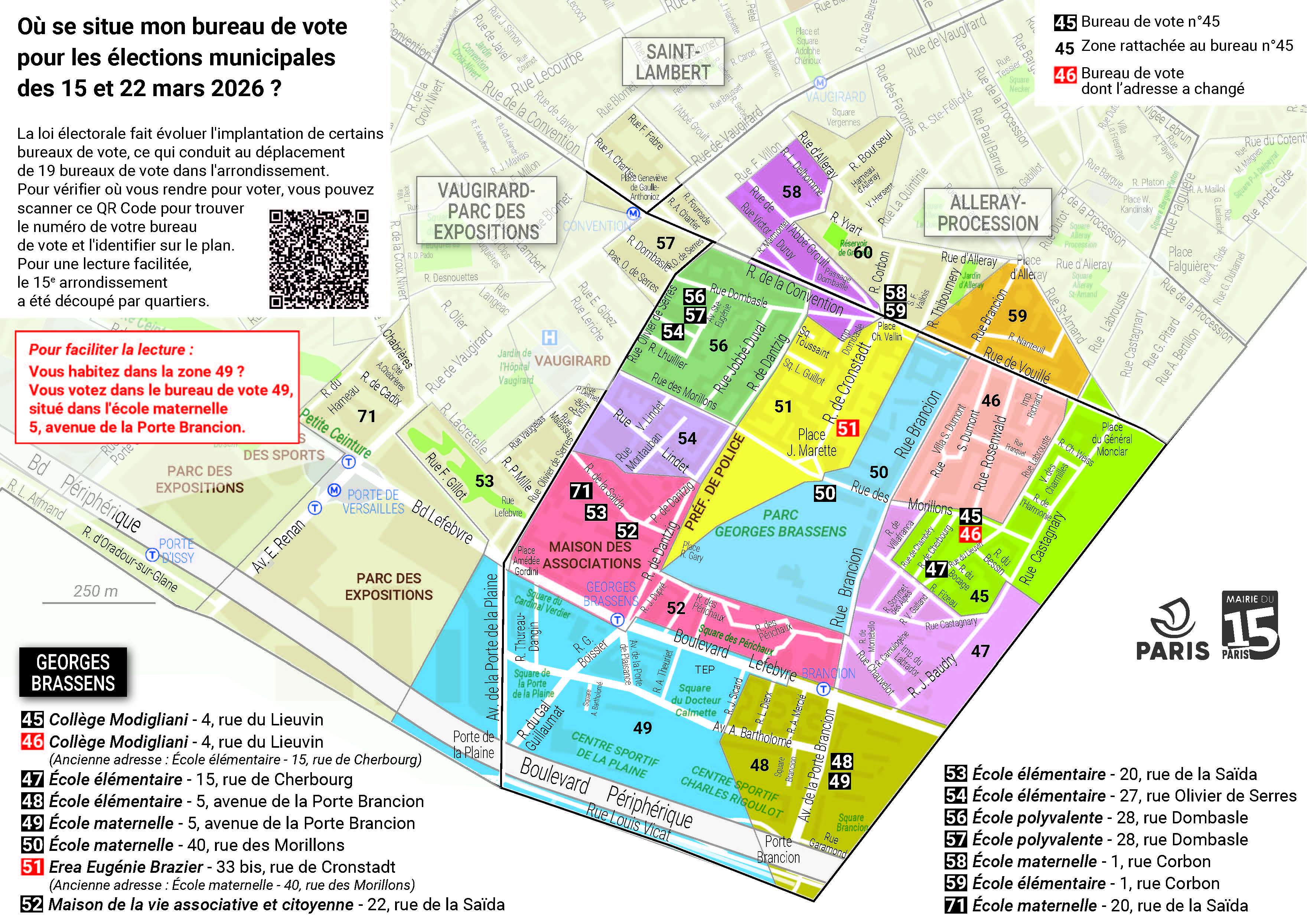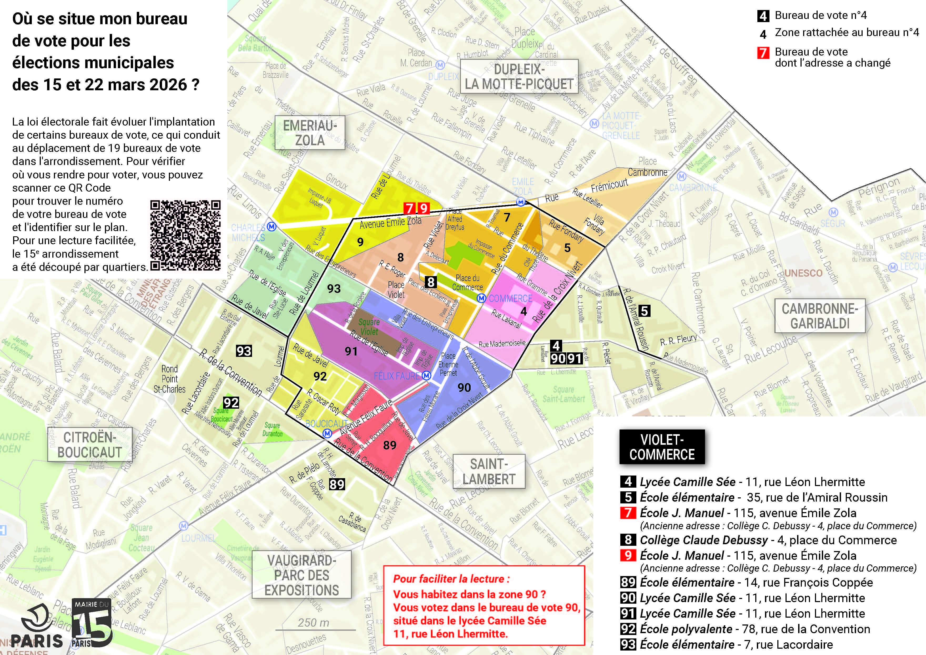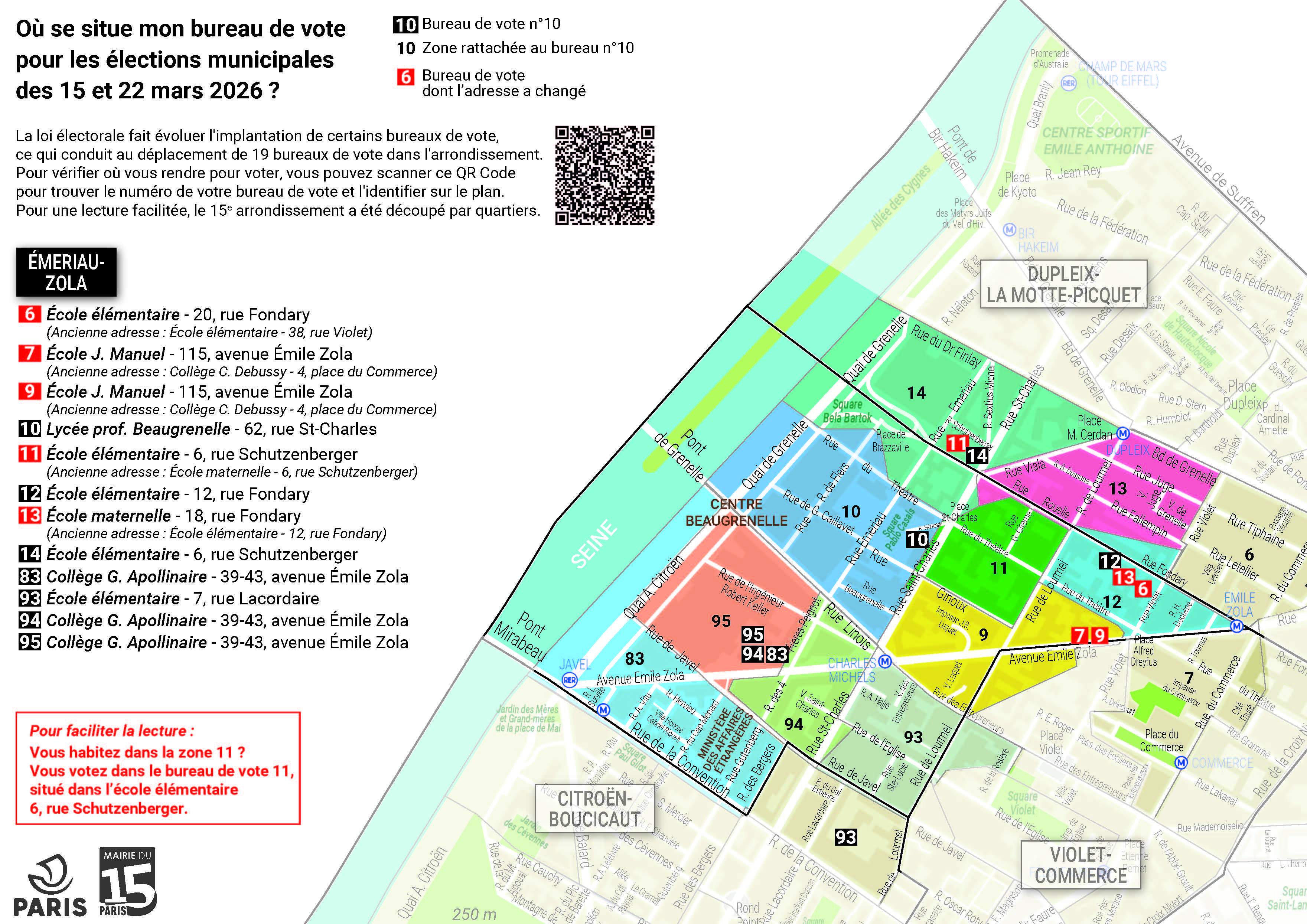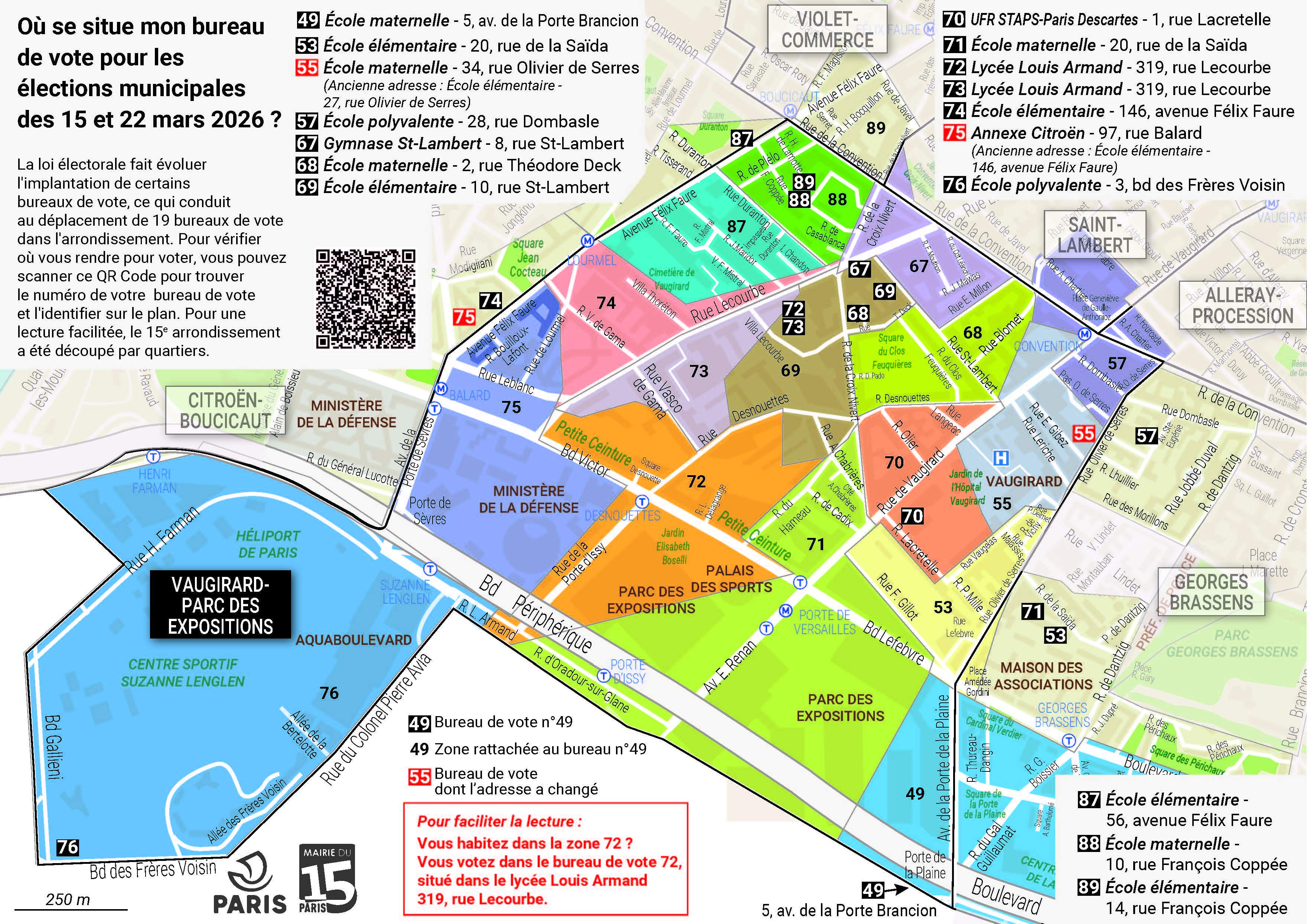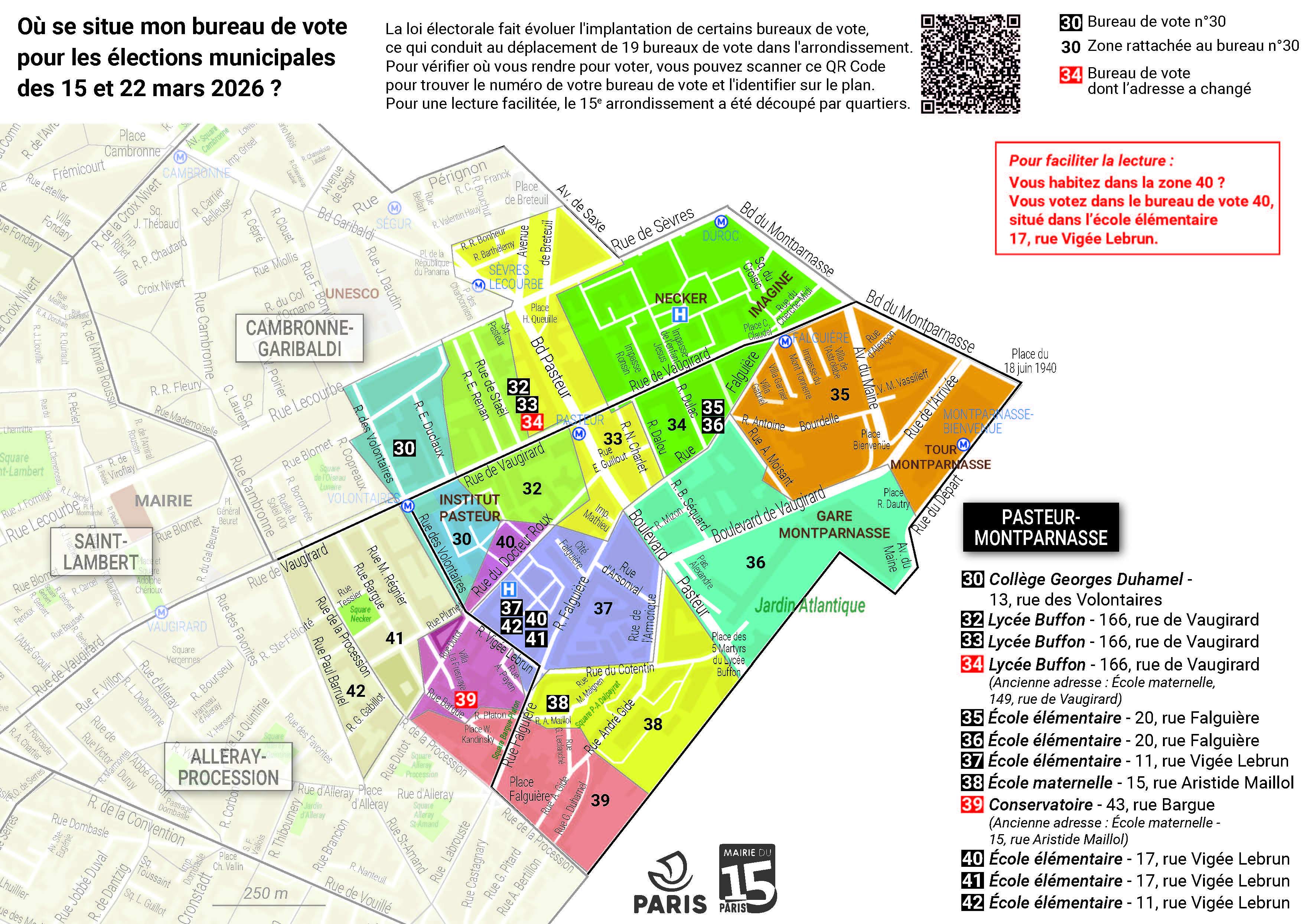 La réforme du mode de scrutin à Paris fait évoluer l'implantation de certains bureaux de vote pour les élections municipales des dimanches 15 et 22 mars. La Mairie du 15e vous invite à vérifier à l'avance la localisation de votre bureau de vote. Identifiez-le sur les plans ci-dessous. Pour une lecture facilitée, le 15e arrondissement a été découpé par quartiers.